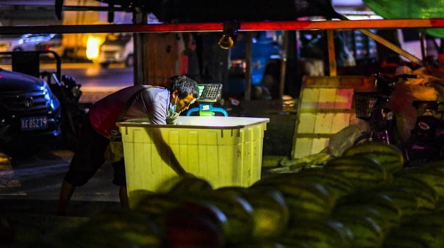 7月26日,在烏魯木齊新聯(lián)農(nóng)副產(chǎn)品綜合市場內(nèi),商販在整理剛進(jìn)的新鮮蔬菜。