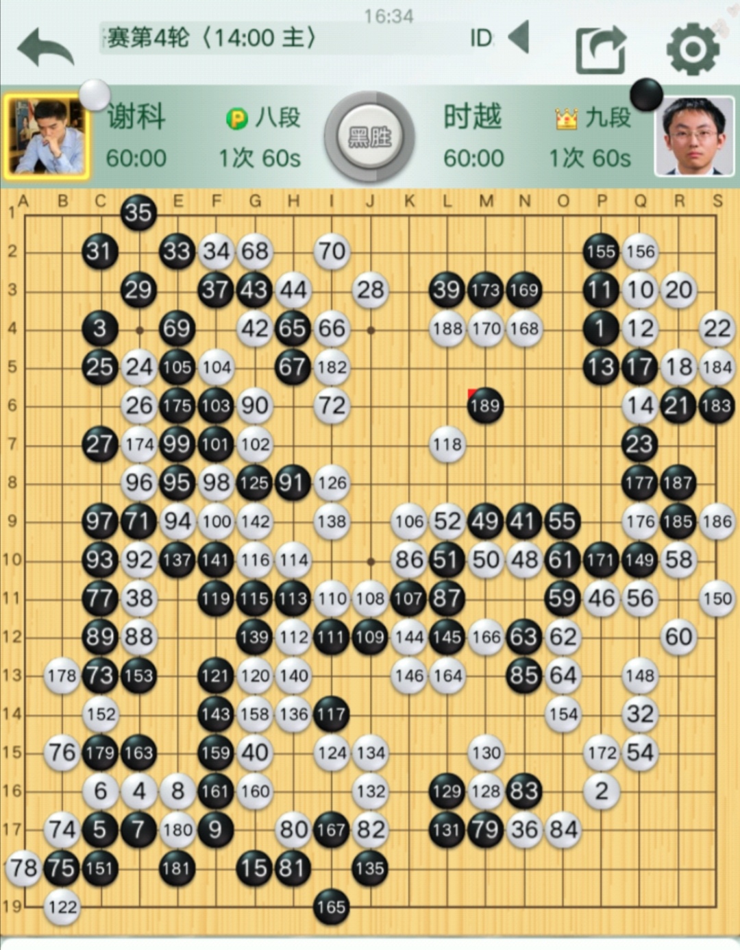 第二臺主將之戰(zhàn)謝科八段VS時越九段(對陣棋譜),時越最后勝出。時越首輪逆襲勝排名第二的楊鼎新九段,本輪再度逆襲得手,倒春寒味道十足。白棋耗費心力經營中腹,但因黑棋在邊空所得更大,白棋大模樣作戰(zhàn)失敗。之后黑棋守牢己方大空,相機壓縮白棋中腹模樣,白棋實空“干不夠”,直至認輸。