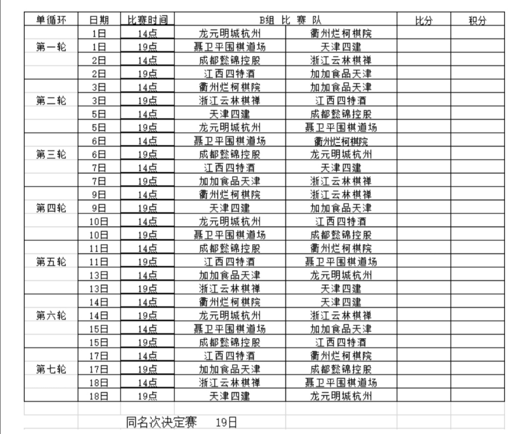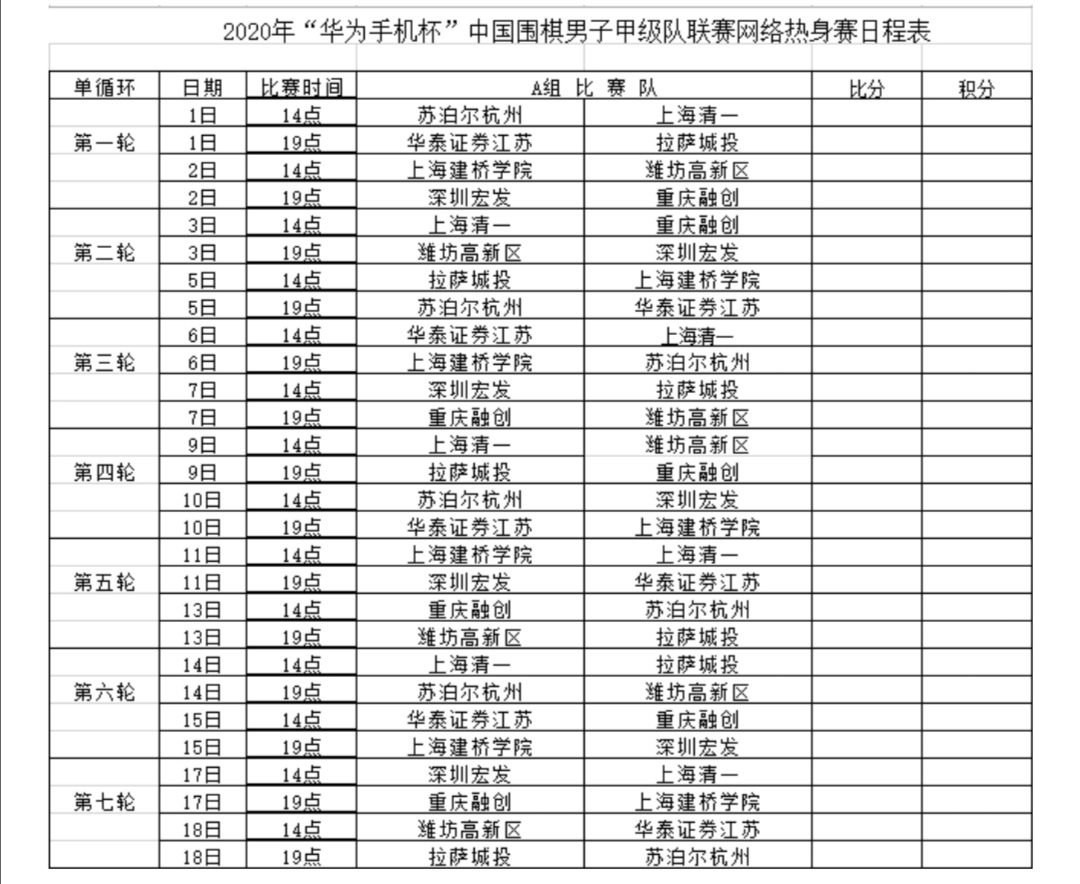 附2:2020年“華為手機杯”中國圍棋男子甲級隊聯(lián)賽網絡熱身賽AB兩組日程表