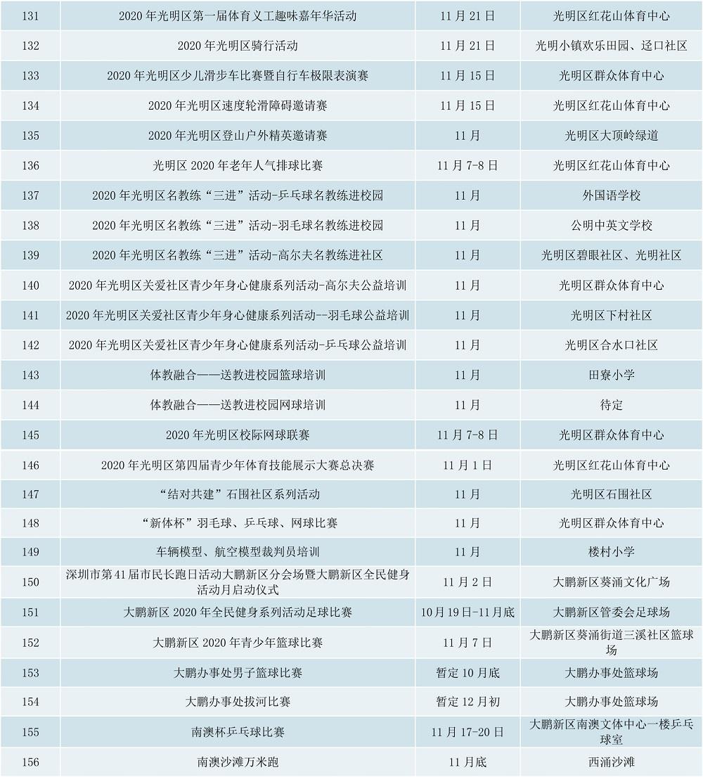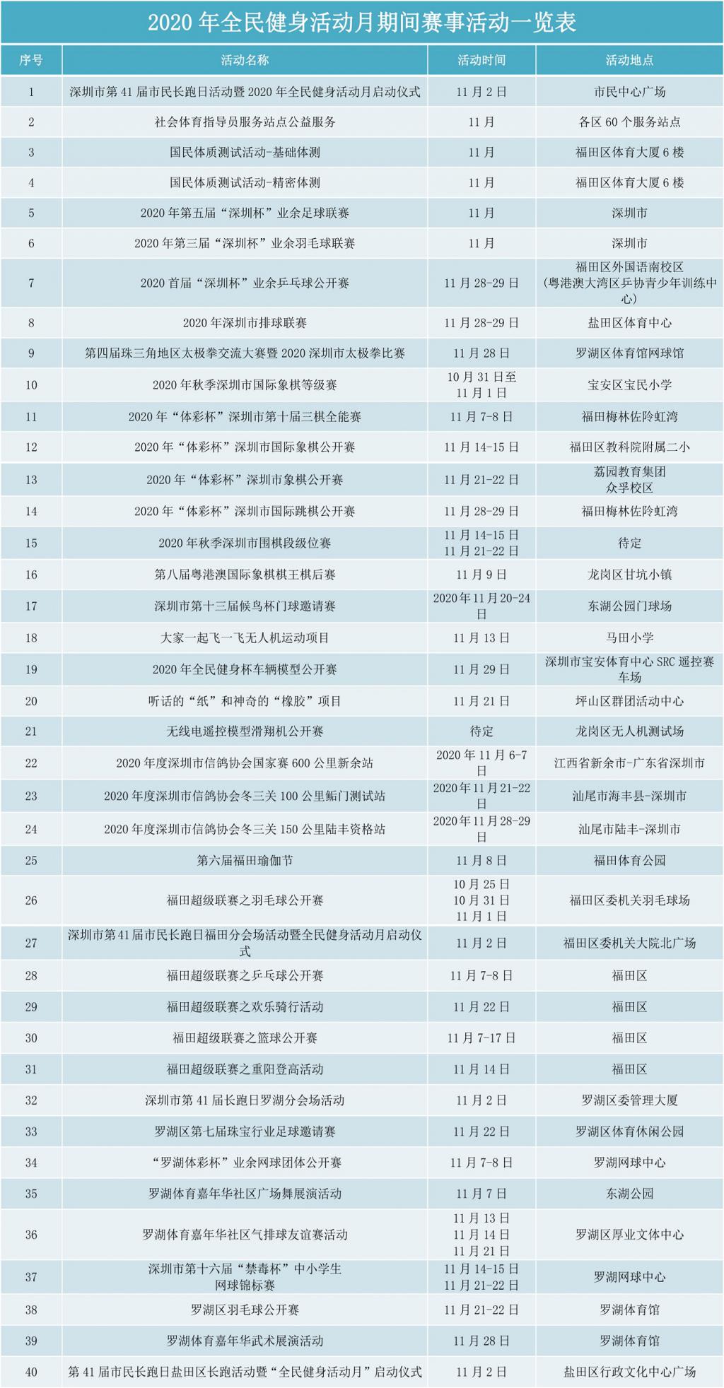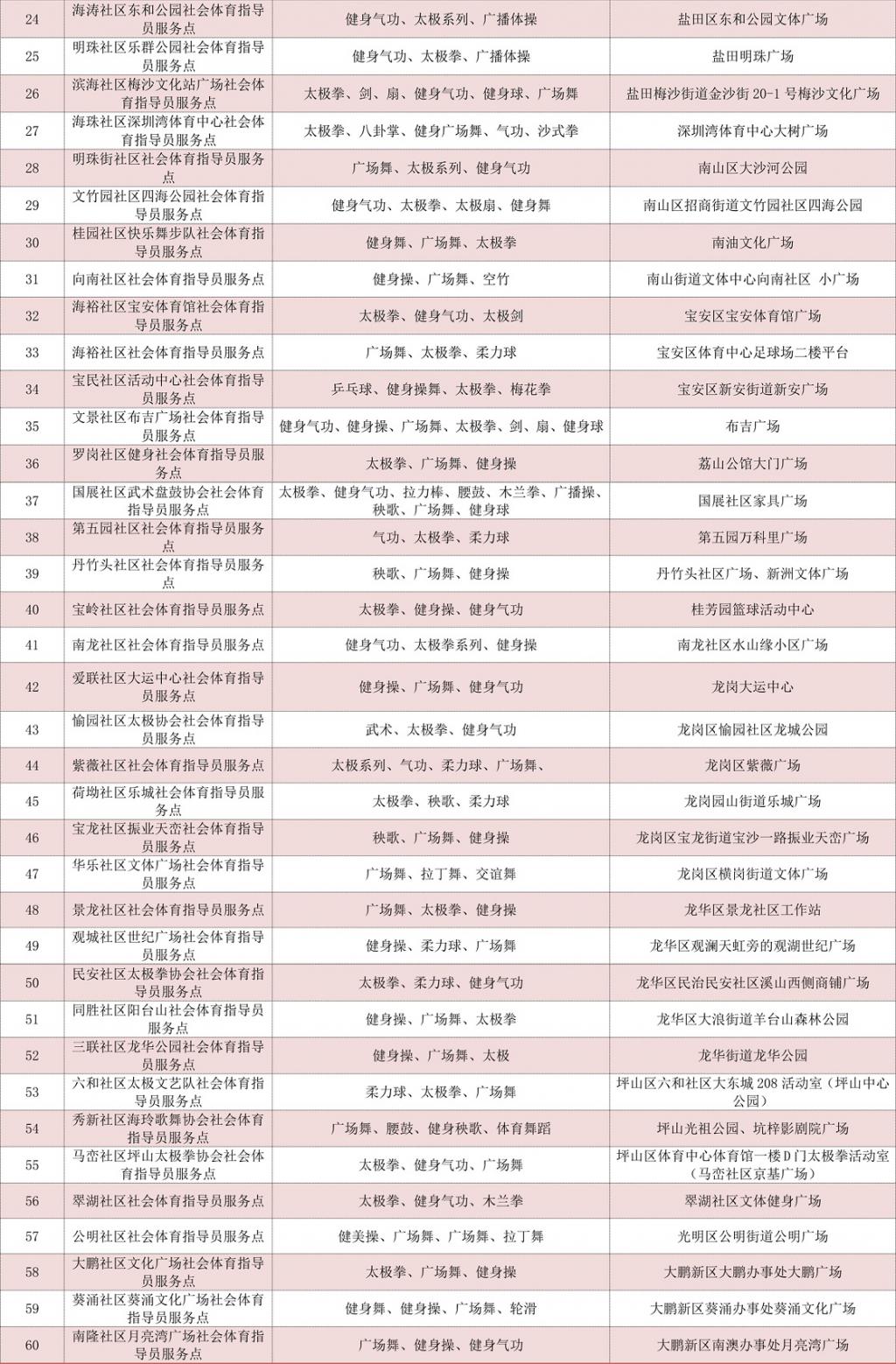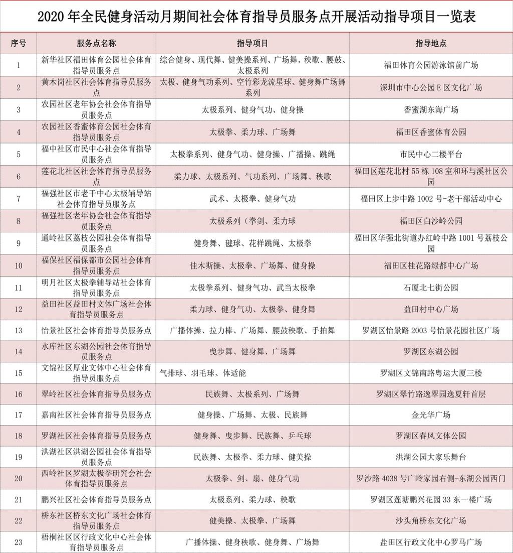 2020深圳全民健身活動月社會體育指導(dǎo)員服務(wù)點(diǎn)表: