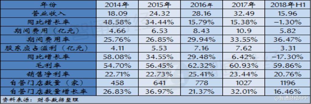 根據(jù)智通財經(jīng)APP的梳理,周黑鴨自營門店數(shù)量在2014年為458家,此后三年公司自營門店數(shù)量每年都有超過20%的增長,但期間公司營業(yè)收入增幅卻呈現(xiàn)放緩的趨勢。與此同時,公司門店數(shù)量的增長也帶來費用率逐年提升,截至2017年,公司期間費用率達到33.55%,以至于公司凈利潤增速同比下滑超過23個百分點。公司2018年中期財報顯示,上半年公司門店數(shù)量凈增長169家,較2017年增長16.46%,門店數(shù)量快速增長的勢頭雖然的已延續(xù),但卻支撐不起公司營收繼續(xù)保持增長,同時公司期間費用率進一步提升至36.47%,導(dǎo)致盈利水平大幅下滑。
