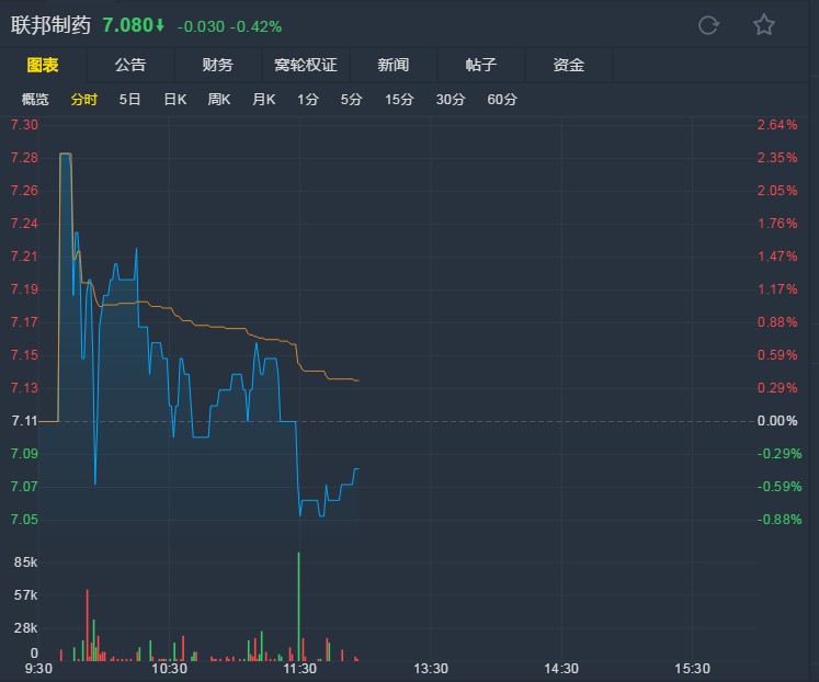 臨近上午收盤,聯(lián)邦制藥報7.08港元,跌0.42%。(文文)