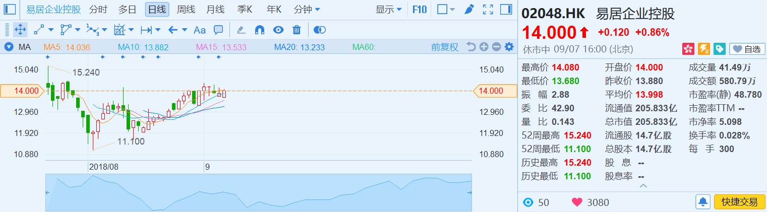 易居是國內(nèi)最大的房地產(chǎn)服務(wù)商,伴隨港股一波熱鬧非凡的上市潮,成立剛滿18年的易居于7月20日風(fēng)風(fēng)火火上市,之后也在新股“破發(fā)潮”中慘遭錯(cuò)殺,一度下探至11.1港元,但價(jià)值總會(huì)回歸,隨著易居的商業(yè)模式和業(yè)績被市場認(rèn)可,股價(jià)逐步回升。