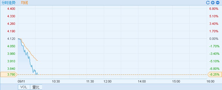 今日早盤(pán)A股鋼鐵板塊低開(kāi)低走,現(xiàn)鋼鐵板塊跌超3%,馬鋼股份(600808)跌逾6%,受此影響,港股馬鞍山鋼鐵股份(00323)也跟隨下跌,截至10時(shí)02分,跌8.25%,報(bào)價(jià)3.78港元,成交額9244萬(wàn)。