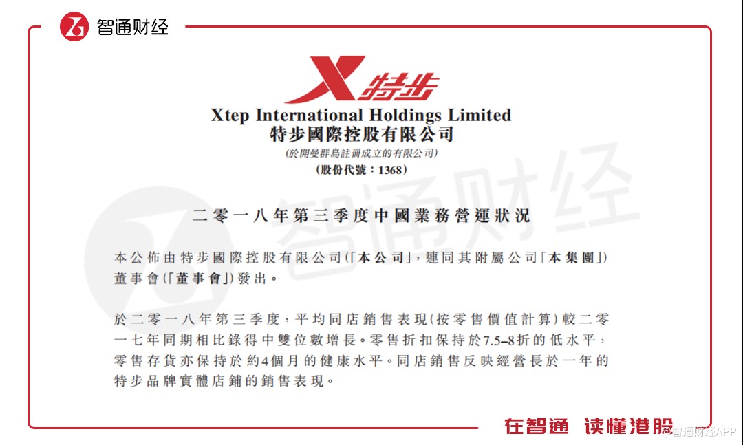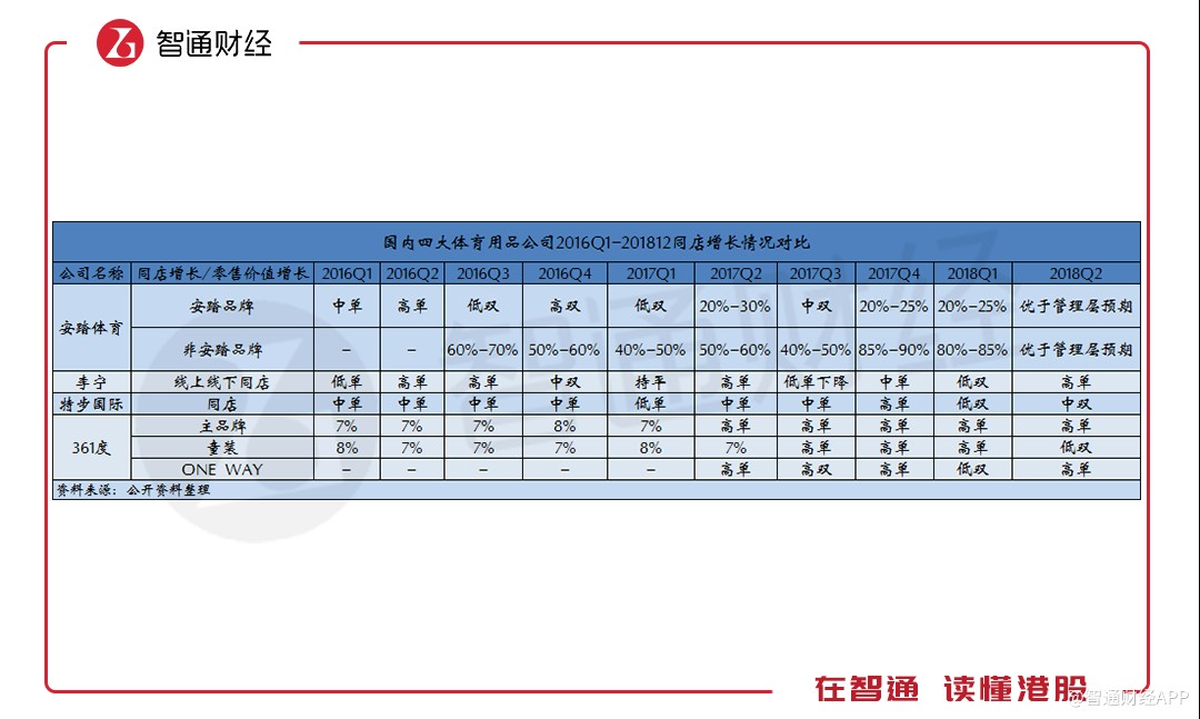 智通財經APP根據公開資料整理發(fā)現,特步過往季度的同店銷售增長水平時常保持在中單位數甚至低單位數的增長水平,直到2018年一季度才實現低雙位數增長,這也是公司自2013年一季度開始披露這一數據以來,首次達到雙位數增長。