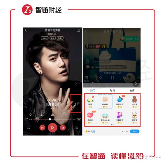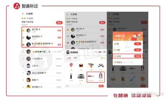 在用戶(hù)進(jìn)入K歌界面后,除了K歌按鍵還有就是歌曲榜單,這些榜單記錄的是該歌曲翻唱獲得禮物數(shù)的排行情況。翻唱歌手被打賞的禮物越多,榜單排名越高,禮物則是靠用戶(hù)通過(guò)現(xiàn)金兌換而來(lái)。與直播打賞類(lèi)似,全民K歌也是通過(guò)用戶(hù)購(gòu)買(mǎi)虛擬禮物進(jìn)行變現(xiàn)。
