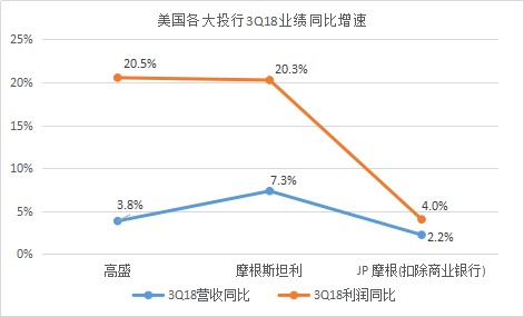 三家投行的3Q18營(yíng)收增速在所有上市公司中排名靠后,從營(yíng)收和利潤(rùn)的同比增速來(lái)看,JP摩根都是排名墊底,高盛和“大摩”的利潤(rùn)增速都超過(guò)20%,大大超過(guò)利潤(rùn)增速。