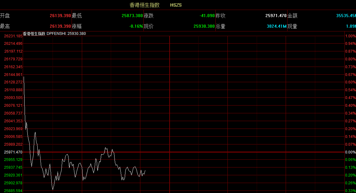 智通財經(jīng)APP獲悉,恒生指數(shù)開盤漲0.65%,報26139.39點。國企指數(shù)漲0.39%,報10526.58點。紅籌指數(shù)漲0.16%,報4272.91點。大市盤前成交12.23億港元。