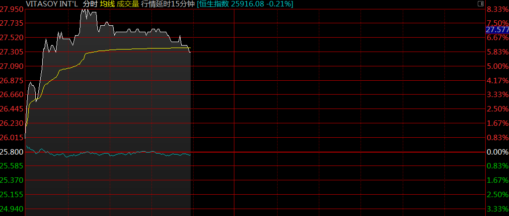 智通財(cái)經(jīng)APP獲悉,維他奶國(guó)際(00345)昨日午間公布中期業(yè)績(jī),中期股東應(yīng)占利潤(rùn)同比增長(zhǎng)30%至5.18億港元,超市場(chǎng)預(yù)期。早盤股價(jià)漲勢(shì)延續(xù),截至9時(shí)56分,漲6.59%,報(bào)價(jià)27.5港元,成交額3661.58萬(wàn)。