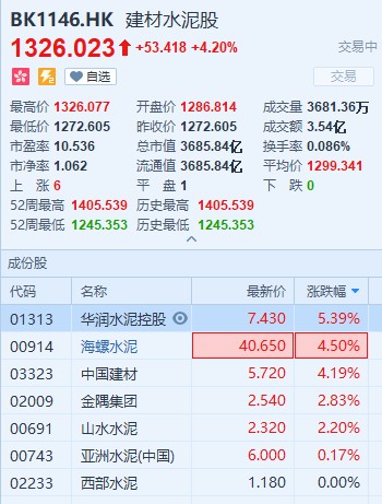 水泥板塊升4.2%華潤水泥控股(01313)領(lǐng)漲