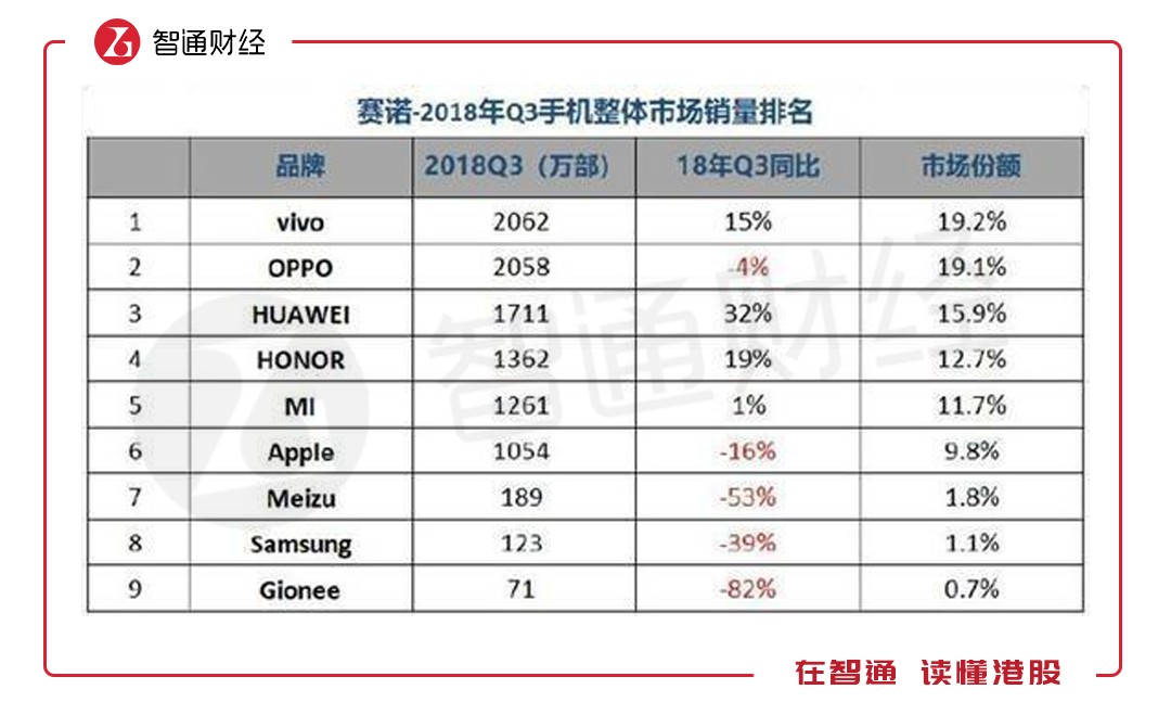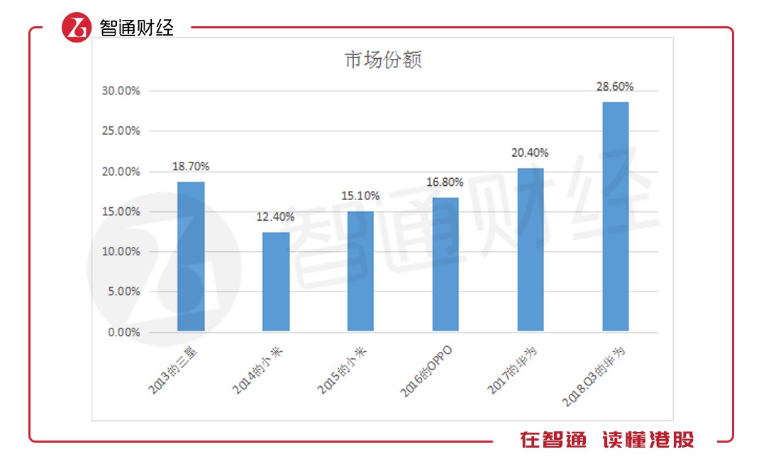 在2008年,全球前六大手機(jī)廠商,諾基亞、三星、摩托羅拉、LG、索尼愛立信和中興(00763),其中只有中興為自主品牌,但市場份額不足5%。再看看2018年這十年的變化,全球前六大手機(jī)廠商,三星、華為、蘋果、小米(01810)、OPPO和Vivo,其中自主品牌占了四個(gè),市場份額合計(jì)占比達(dá)40%。