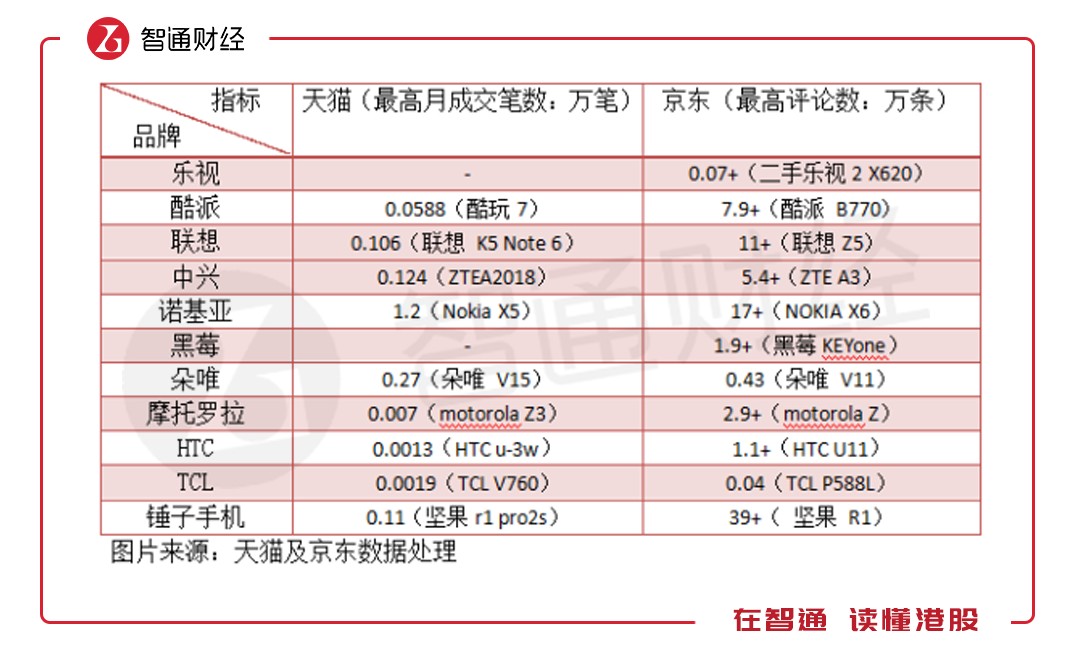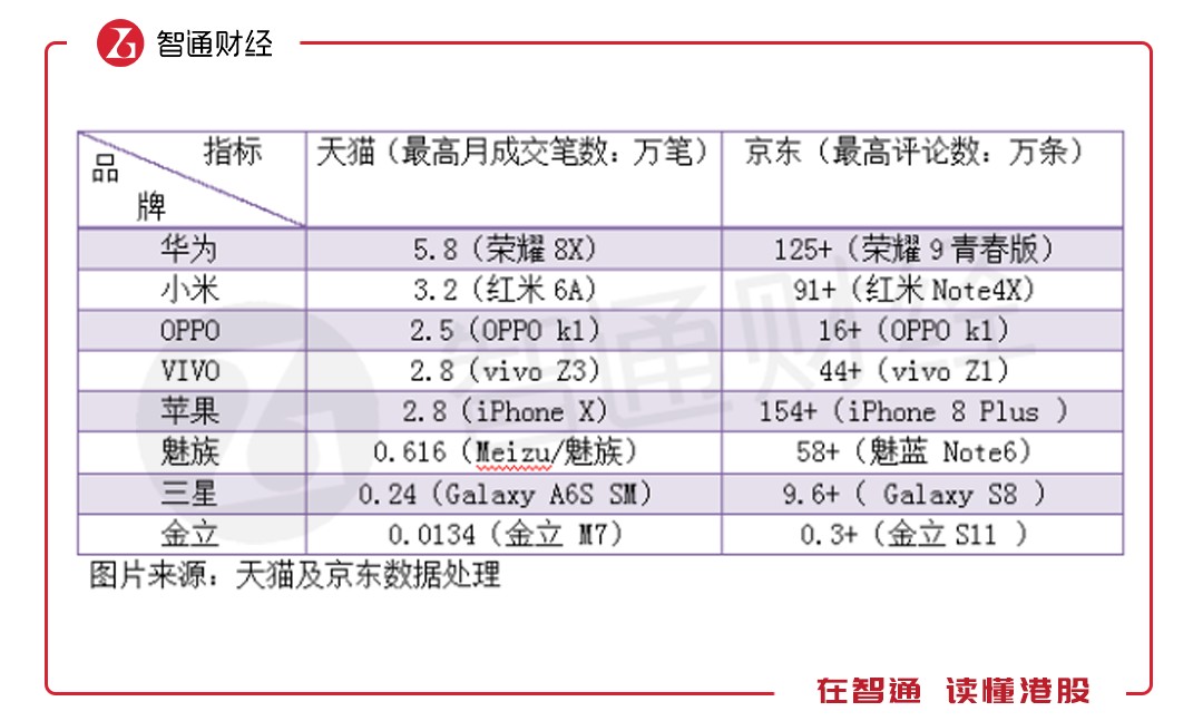 電商的崛起讓手機(jī)多了一條網(wǎng)絡(luò)強(qiáng)大的銷售渠道,目前天貓和京東是電商平臺(tái)中的兩大巨頭,國內(nèi)的最終商品基本在這兩大平臺(tái)售賣。智通財(cái)經(jīng)APP通過天貓及京東相對(duì)應(yīng)的月成交筆數(shù)及評(píng)論數(shù)了解不同品牌的智能手機(jī)售賣情況。