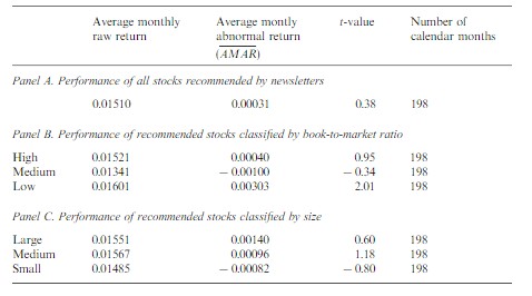 此外,美國學者Jaffe和Mahoney在1999年的一篇學術論文《The performance of investment newsletters》中,對1980-1996年間的近100份投資預測的系統性分析后得出結論,稱這些投資建議的回報還不及它們所對應的比較基準。也就是說,這些專家提供的薦股服務的價值為零。
