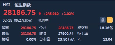 智通財(cái)經(jīng)APP獲悉,恒生指數(shù)開盤漲285.91點(diǎn)或1.02%,報(bào)28186.75點(diǎn)。國(guó)企指數(shù)漲1.1%,報(bào)11057.72點(diǎn)。紅籌指數(shù)漲1.07%,報(bào)4499.71點(diǎn)。大市盤前成交18.16億港元。中美經(jīng)貿(mào)高級(jí)別磋商結(jié)束。1月份社會(huì)融資數(shù)據(jù)超預(yù)期。