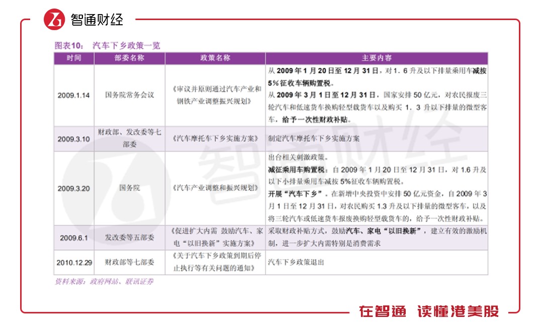 智通財(cái)經(jīng)APP了解到,此次汽車下鄉(xiāng)并非首次,我國(guó)曾于2009年開展的汽車下鄉(xiāng),當(dāng)時(shí)新增中央投資安排50億資金,對(duì)農(nóng)民購(gòu)買的指定車型進(jìn)行補(bǔ)貼,但該項(xiàng)政策于2010年退出舞臺(tái)。2015年因汽車銷量萎靡,政策再次出馬,當(dāng)時(shí)主要以減征車輛購(gòu)置稅為主,但并非汽車下鄉(xiāng)措施。
