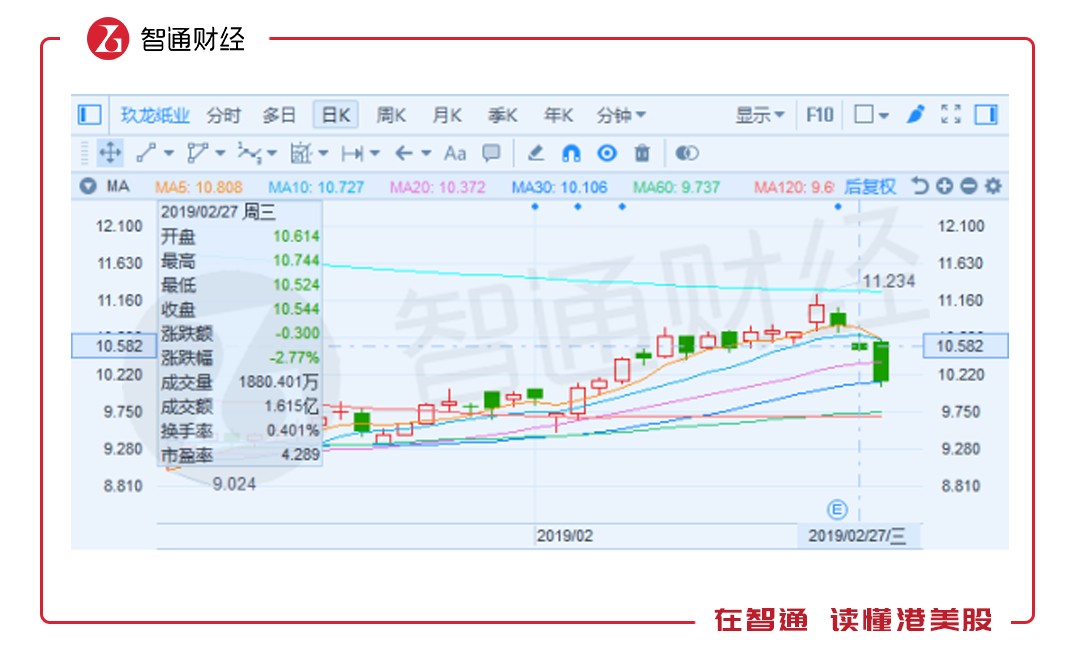自周一港A股暴漲之后,玖龍紙業(yè)(02689)股價(jià)便已經(jīng)歷連續(xù)三天下跌。2月27日,公司召開業(yè)績會(huì)當(dāng)天,公司股價(jià)收?qǐng)?bào)10.54,跌2.77%;28日續(xù)跌4.68%至8.14港元。
