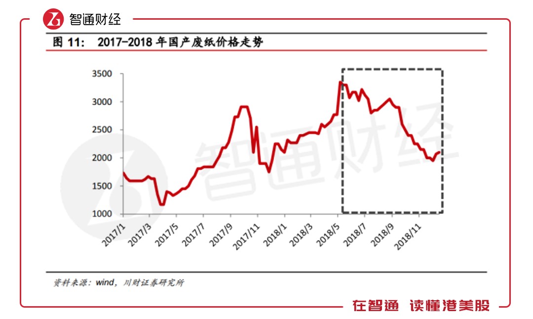 而在2018年,進(jìn)口廢紙配額大幅減少及質(zhì)量要求的收緊,導(dǎo)致了進(jìn)口及國內(nèi)廢紙的供應(yīng)及價(jià)格均出現(xiàn)急劇波動(dòng)。因此售價(jià)在業(yè)績期間內(nèi)出現(xiàn)普遍下跌,造成盈利能力的下跌。且據(jù)券商預(yù)計(jì),2019年外廢進(jìn)口政策將繼續(xù)收緊,到2020年將全面禁止外廢進(jìn)口,這將進(jìn)一步對(duì)紙業(yè)原材料價(jià)格產(chǎn)生影響。