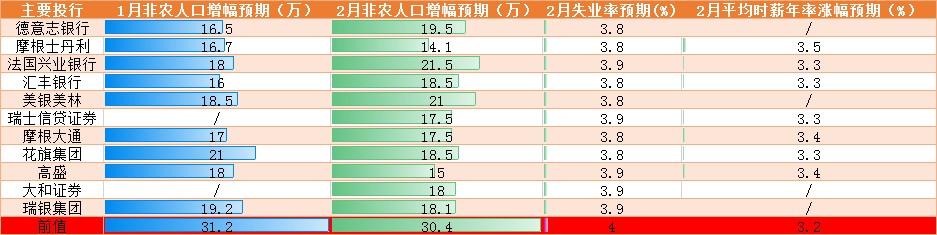 但是,根據智通財經APP整理出的11家大型投行的非農預測顯示,相對于1月非農就業(yè)人口大增30.4萬而言,各投行對于美國2月非農就業(yè)人口增幅的預期不太樂觀。整體來看,華爾街對美國2月季調后非農就業(yè)人口增幅預測介于14.1萬-21.5萬之間,失業(yè)率預測介于3.8%-3.9%之間,平均時薪年率增幅預測介于3.3%-3.5%之間。