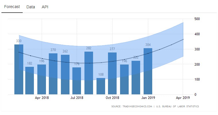 根據Trading Economics的預測,2月非農數據將會延續(xù)1月的勢頭,呈現上行趨勢。