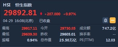 智通財(cái)經(jīng)APP獲悉,恒指早盤高開(kāi)125.84點(diǎn)或0.43%,報(bào)29730.85點(diǎn)。截至收盤,恒生指數(shù)漲287.8點(diǎn)或0.97%,報(bào)29892.81點(diǎn),全日成交額達(dá)747.22億。國(guó)企指數(shù)漲1.11%,報(bào)11638.18點(diǎn),紅籌指數(shù)漲0.83%,報(bào)4620.34點(diǎn)。