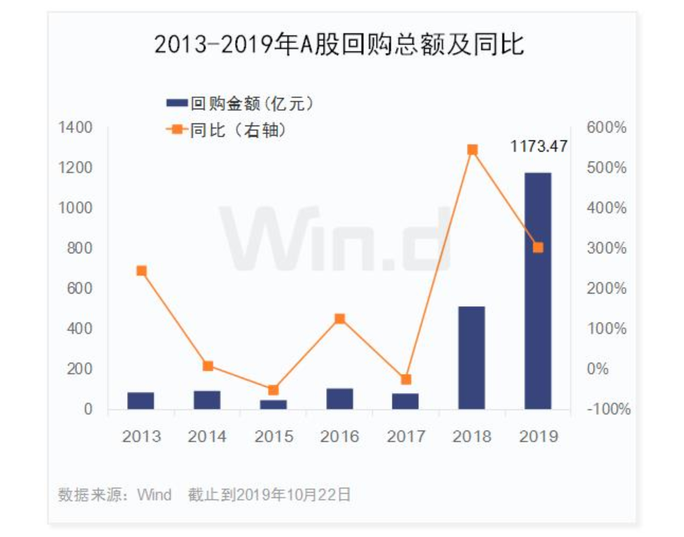 2、A股回購數(shù)量和金額呈爆發(fā)式增長(zhǎng):截止10月22日,2019年兩市已有974家公司實(shí)施了1397筆回購,總回購金額已達(dá)1173.47億元,較去年同期增幅超過3倍。