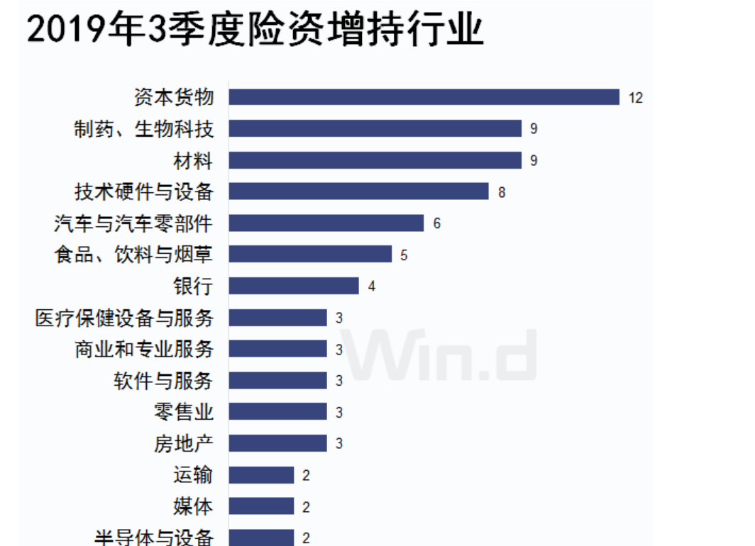 險資財大氣粗,其一舉一動受到資本市場密切關(guān)注:據(jù)Wind數(shù)據(jù)統(tǒng)計,截止2019年3季度末,兩市共有376家上市公司被險資持有,持有股數(shù)約為833.21億股;132只保險產(chǎn)品共持有約12380億元市值A(chǔ)股股票。資本貨物、醫(yī)藥、軟硬件、食品等獲重點(diǎn)增持。