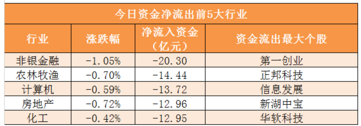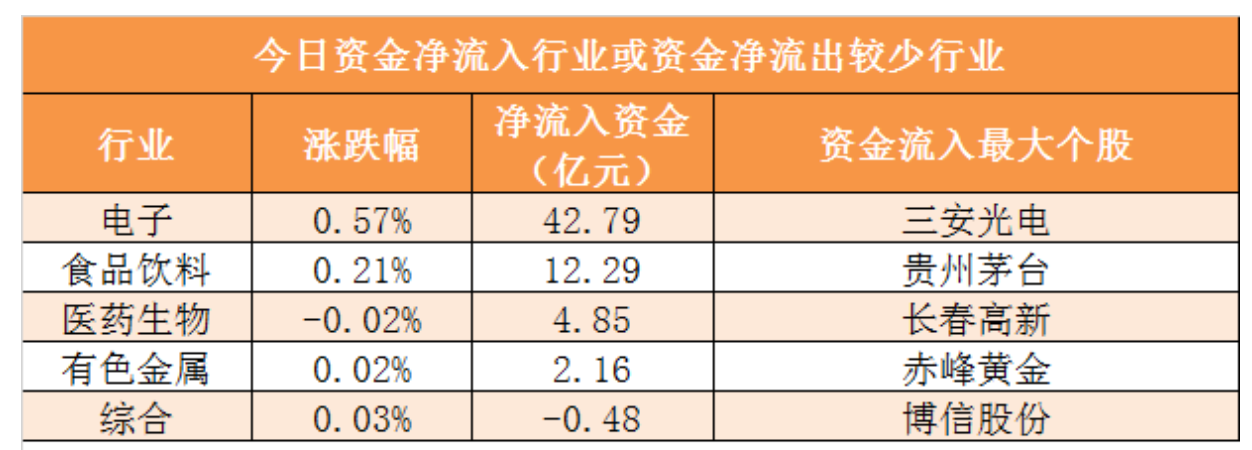 資金流向:28個(gè)申萬一級行業(yè)中,4個(gè)行業(yè)實(shí)現(xiàn)資金凈流入,其中電子行業(yè)凈流入42.79億元居首。