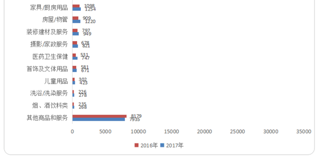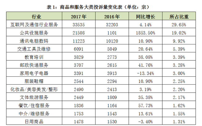 2017年,商品和服務(wù)二十五大類(lèi)投訴中,互聯(lián)網(wǎng)及通信行業(yè)服務(wù)、公共設(shè)施服務(wù)、通訊電腦數(shù)碼投訴量居前三位,均超過(guò)1萬(wàn)宗,分別占投訴總量的29.65%、19.02%和9.92%。