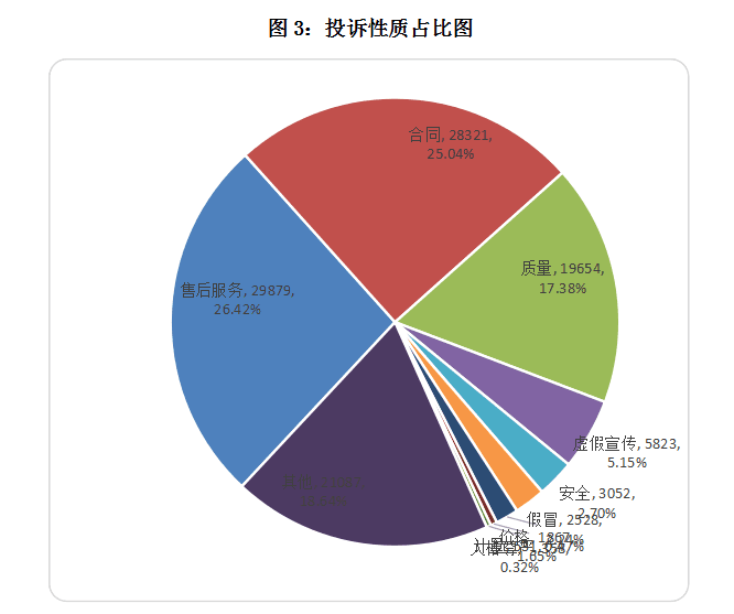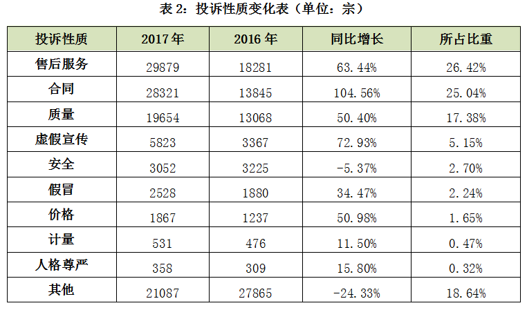 2017年,消費者反映最突出的投訴性質分別是售后服務29879宗,占26.42%;合同28321宗,占25.04%;質量19654宗,占17.38%;三大性質類別的投訴占比都超過了15%。