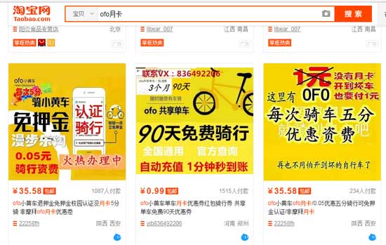 人民網(wǎng)IT頻道記者在調(diào)查中發(fā)現(xiàn),在摩拜和ofo的月卡漲價(jià)5-10倍的同時(shí),兩家公司大量的高折扣優(yōu)惠卡卻轉(zhuǎn)移到淘寶等電商平臺(tái)公開出售,在淘寶上輸入“摩拜月卡”、“ofo月卡”則出現(xiàn)了大批免押金、8.8元包月、9.99元包月、0.05元騎行資費(fèi)的廣告,這些高折扣的優(yōu)惠卡從何而來,卻是一個(gè)謎。