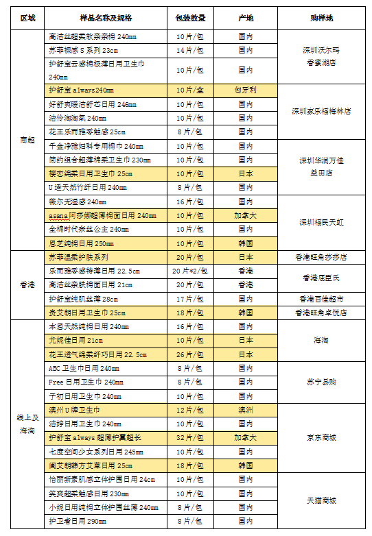 據(jù)前期調(diào)研發(fā)現(xiàn),國外品牌衛(wèi)生巾更受女性消費者青睞,很多消費者認為國外品牌衛(wèi)生巾質(zhì)量更優(yōu)更值得信賴,進而選擇跨境或海淘等方式購買國外產(chǎn)品。因此,本次樣品分別從深圳商超、香港、線上海淘購買樣品進行測試和比較,樣品涉及11款國外原裝產(chǎn)品。詳見下表。