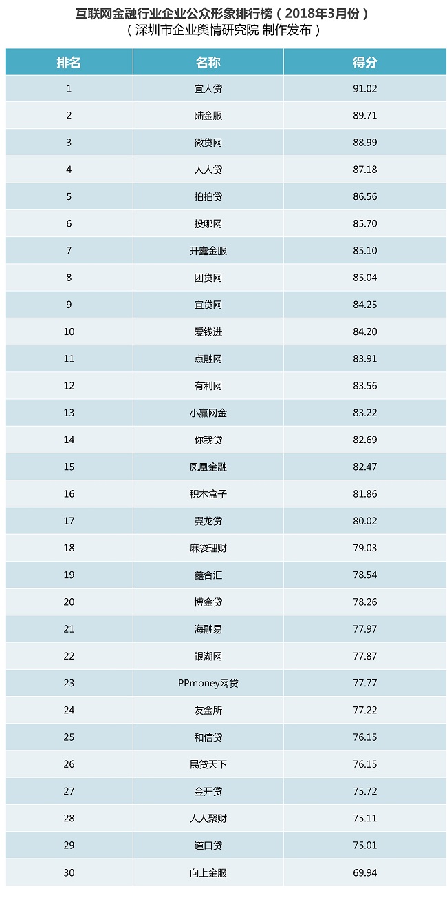 互聯(lián)網(wǎng)金融行業(yè)企業(yè)公眾形象排行榜:本榜單根據(jù)公開可查的信息、數(shù)據(jù),從規(guī)模實(shí)力、合規(guī)性、交易金額、信披透明度、輿論曝光度和負(fù)面影響等六個(gè)維度,對2018年3月1日至3月31日這一時(shí)段內(nèi)互聯(lián)網(wǎng)金融行業(yè)各企業(yè)的公眾形象進(jìn)行綜合評估并排名,旨在對互聯(lián)網(wǎng)金融行業(yè)各企業(yè)開展品牌形象塑造、宣傳推廣策略、公共關(guān)系維護(hù)、品牌影響力等方面的綜合評價(jià),既幫助相關(guān)企業(yè)找準(zhǔn)合適的品牌定位、發(fā)展方向,也為消費(fèi)者和投資者提供科學(xué)、公正、獨(dú)立的消費(fèi)和投資決策參考。