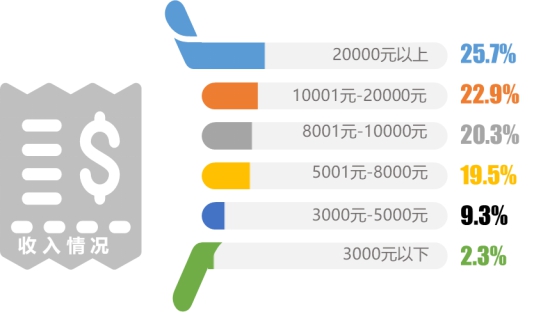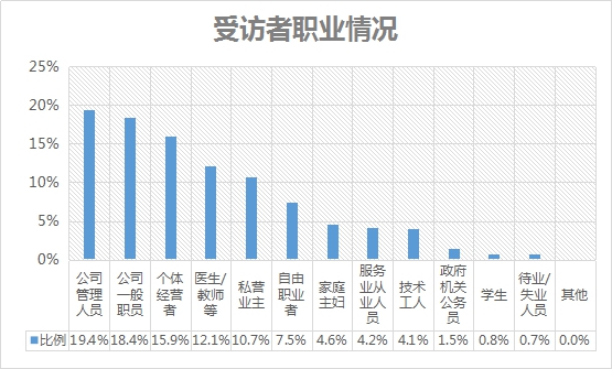 本次調(diào)研中,公司管理人員的比例最高,為19.4%,其次是公司一般職員,占比為18.4%;68.9%的受訪者其個(gè)人月收入超過(guò)8000元。