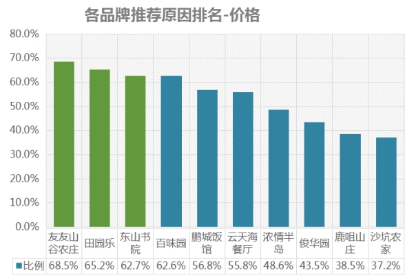 排名第一的是友友山谷農(nóng)莊,價(jià)格推薦率為68.5%;其次是田園樂,推薦率為65.2%;第三名是東山書院,推薦率為62.7% 。