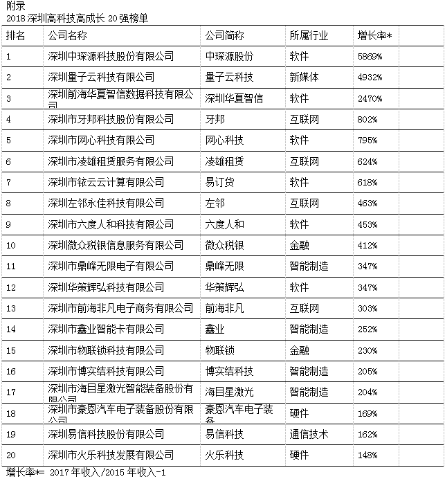 今年,榮登“深圳20強(qiáng)”三甲的獲獎(jiǎng)企業(yè)分別為深圳中琛源科技股份有限公司、深圳量子云科技有限公司和深圳前海華夏智信數(shù)據(jù)科技有限公司,他們?cè)谶^去三年中表現(xiàn)出的平均增長率分別為5,869%、4,932%和2,470%。本年度入選“深圳20強(qiáng)”的企業(yè)除了軟件、硬件、互聯(lián)網(wǎng)和通訊技術(shù)外,也不乏其他新興領(lǐng)域,如新媒體、智能制造和金融科技。此外,為表彰深圳市當(dāng)?shù)乇憩F(xiàn)優(yōu)秀且極具潛力的初創(chuàng)企業(yè),今年共有20家企業(yè)獲選“深圳明日之星”,它們來自多個(gè)不同的領(lǐng)域,包括人工智能、智能設(shè)備、電子商務(wù)、教育、生物醫(yī)藥、金融科技和互聯(lián)網(wǎng)平臺(tái)服務(wù)等 (詳見附錄)。獲選成為“深圳20強(qiáng)”和“深圳明日之星”的企業(yè),將自動(dòng)成為“中國高科技高成長50強(qiáng)”(簡(jiǎn)稱“中國50強(qiáng)”)和“中國明日之星”的候選企業(yè),并在今年11月與全國其他入圍企業(yè)角逐,躋身全國增長最快、最具發(fā)展?jié)摿Φ母呖萍计髽I(yè)之列。