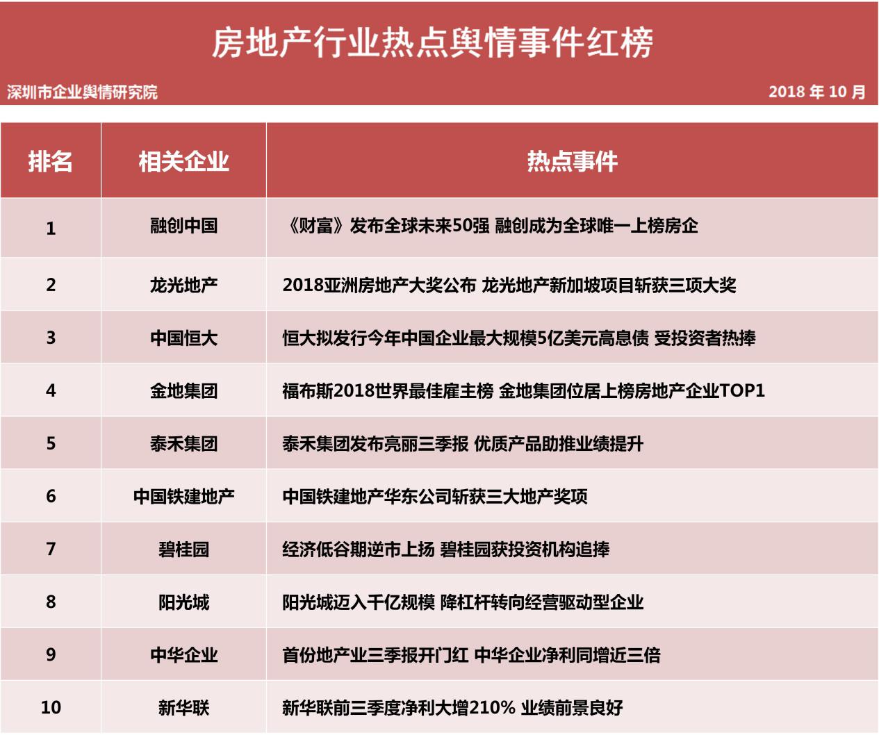 榜單顯示,紅榜中,融創(chuàng)中國在上期獲得紅榜“最紅”企業(yè)后,本期再次榮登紅榜榜首,本期中融創(chuàng)中國能再次登頂與其獲得“《財(cái)富》未來全球50強(qiáng)”有著重要的關(guān)系,同時融創(chuàng)中國也成為2018 《財(cái)富》未來全球50強(qiáng)企業(yè)中唯一上榜的房產(chǎn)企業(yè);黑榜中,地產(chǎn)行業(yè)巨頭“萬科”,因一條關(guān)于萬科給降價前購買廈門白鷺郡的業(yè)主每戶“退款100萬”的消息,身陷羅生門。此消息一出瞬間引爆了地產(chǎn)圈,同時也讓其成為本期中最受關(guān)注的“負(fù)面”熱點(diǎn)事件。