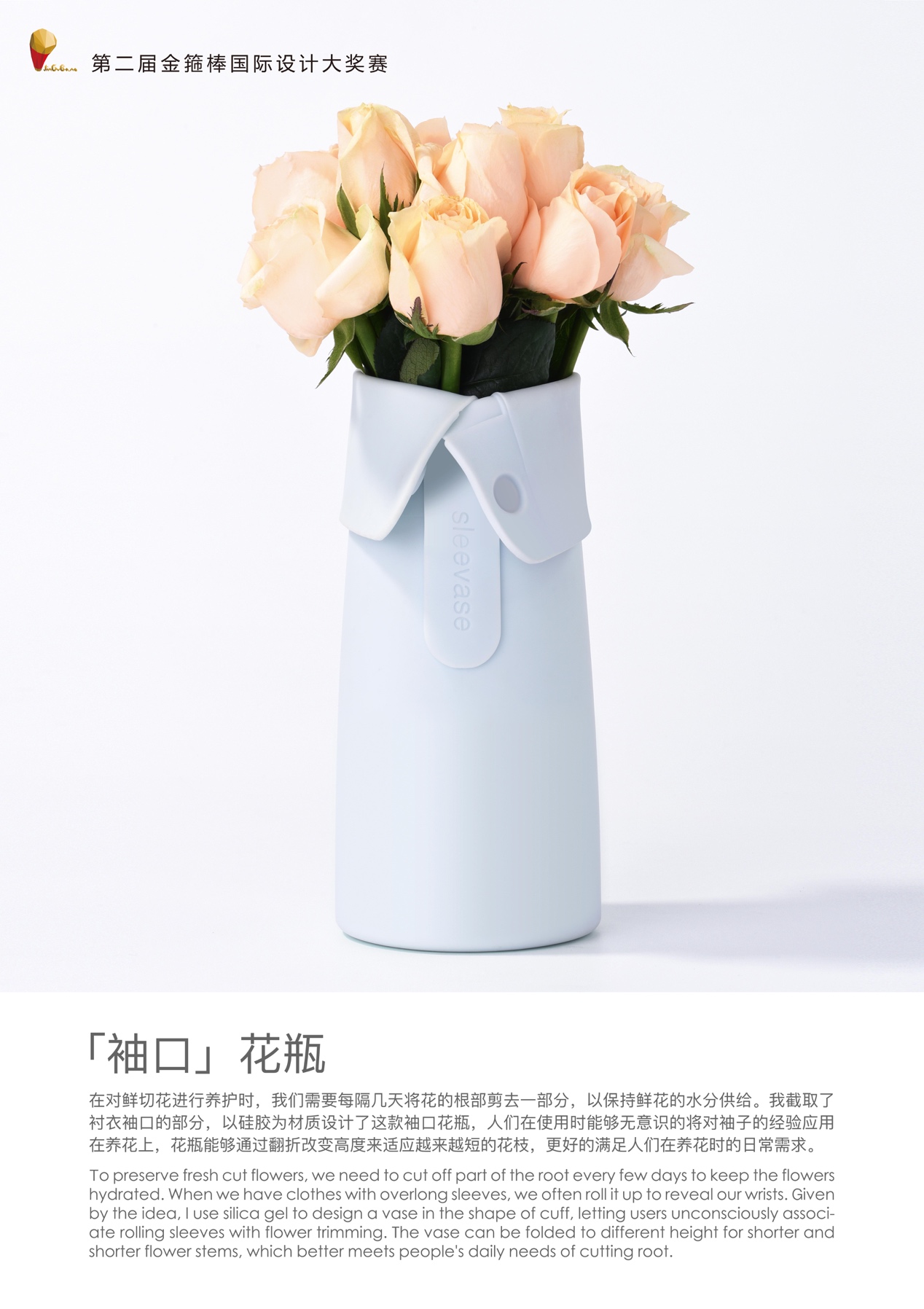 這件作品將衣袖造型應(yīng)用于植物養(yǎng)護,用戶可以通過翻折來改變花瓶高度,從而適應(yīng)不同長短的花枝。設(shè)計師抓住了人們?nèi)粘I钪蟹浅<?xì)微的一個痛點,進行了大膽的設(shè)計,作品本身簡約且意趣盎然,同時具有很強的產(chǎn)業(yè)化可行性,因而也獲得了評委們的芳心。