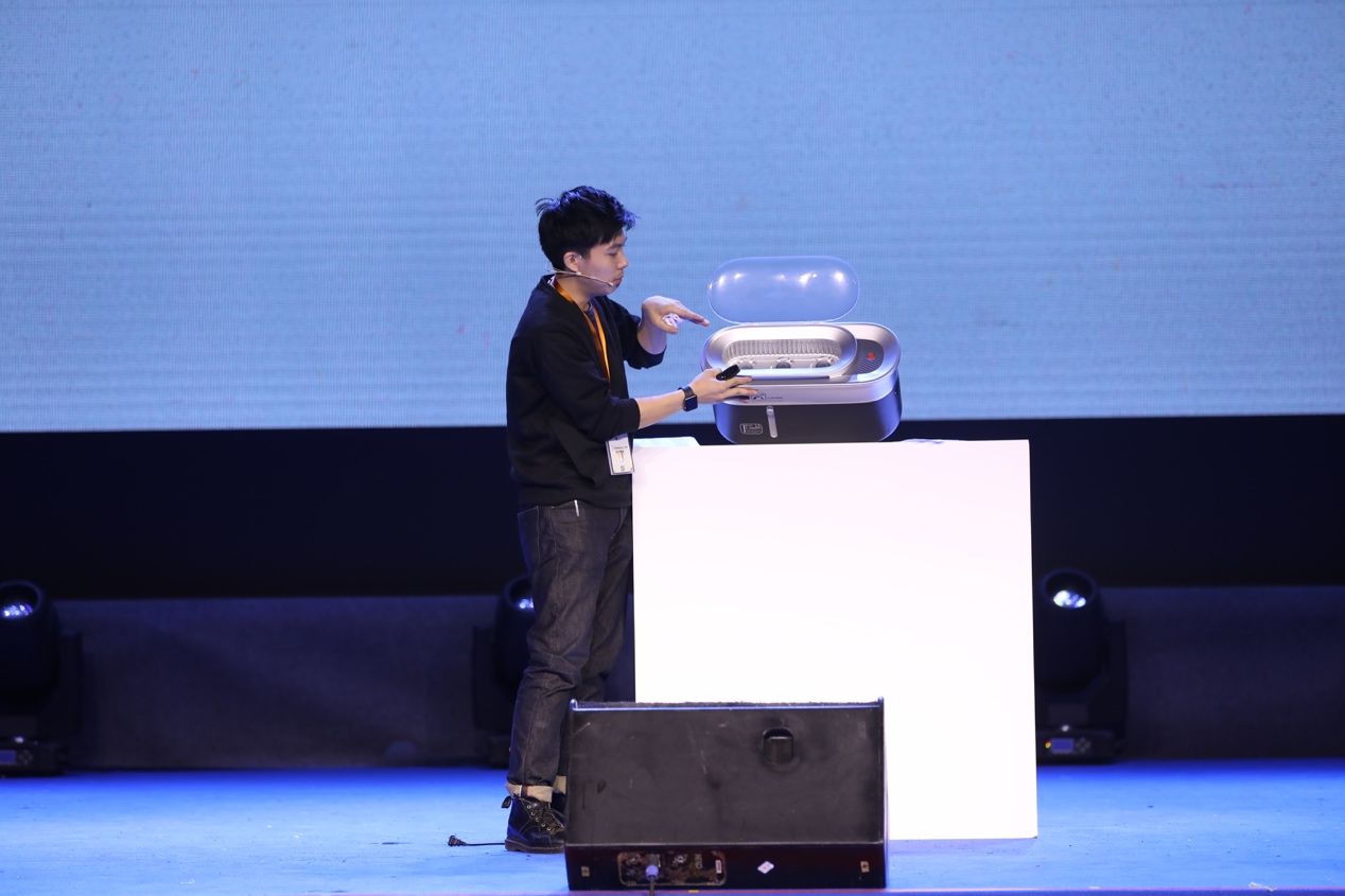 10件作品的設(shè)計師全部完成作品答辯后,7位評委進入評審室進行統(tǒng)計結(jié)果復(fù)議。在此期間,首屆金箍棒國際設(shè)計大獎賽金獎得主賈鵬,以及金箍棒工業(yè)產(chǎn)品設(shè)計江陰有限公司運營總監(jiān)何田鑫分別上臺,為現(xiàn)場觀眾帶來產(chǎn)品設(shè)計和創(chuàng)業(yè)理念方面的分享,獲得了現(xiàn)場的陣陣掌聲。
