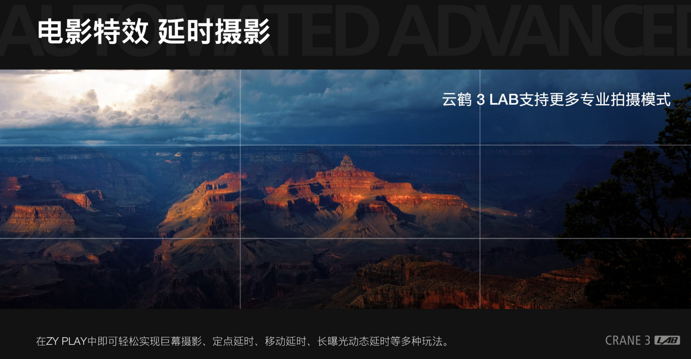云鶴3 LAB針對延時攝影作出深度優(yōu)化,探索出更多高階玩法:靜態(tài)延時、移動延時、軌跡延時、大范圍延時、三軸延時、焦點延時、巨幕攝影、三維夢境,瘋狗模式。