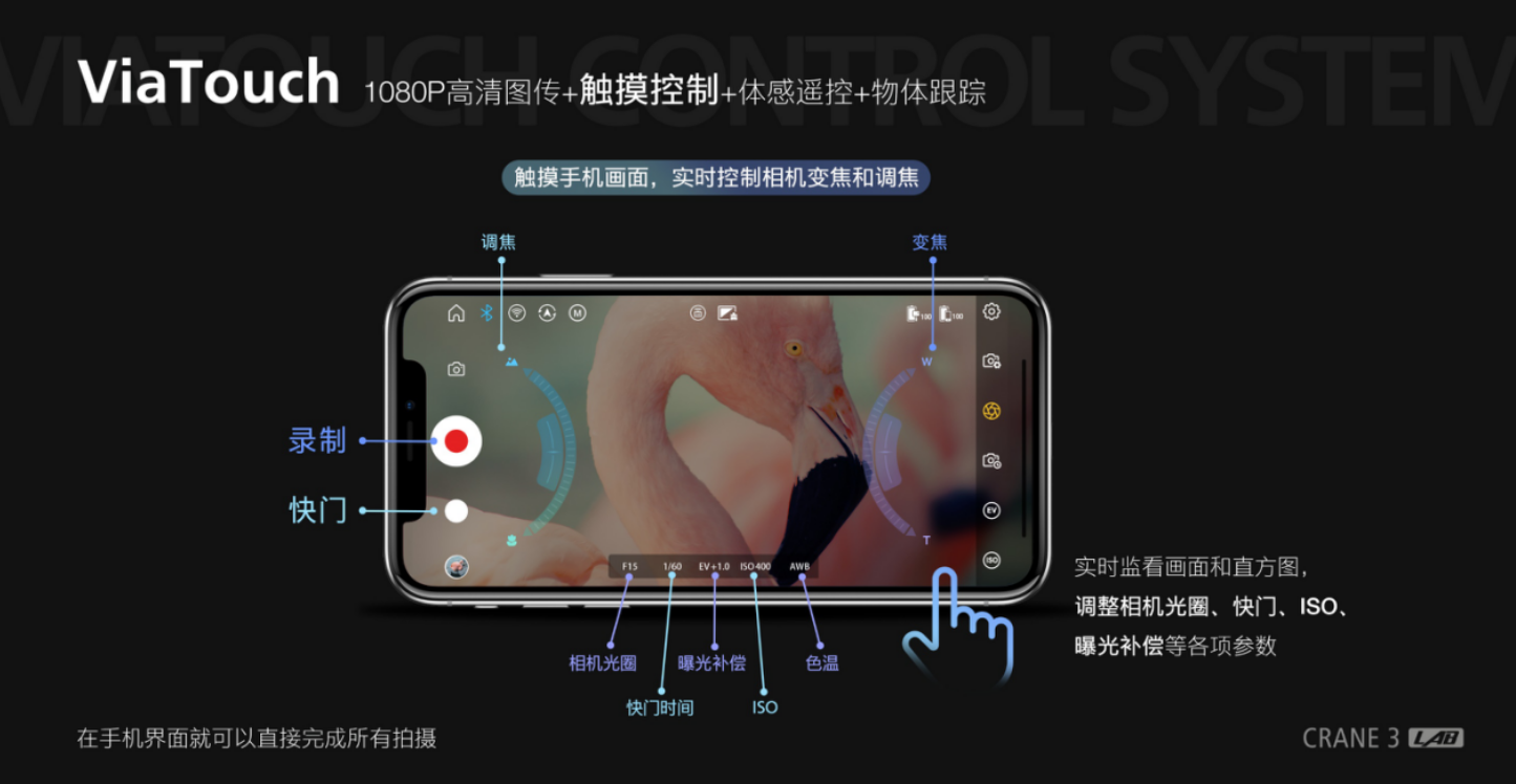 全新的ViaTouch交互功能:云鶴3 LAB搭載旗艦無線圖傳系統(tǒng),最高支持1080P的分辨率,手機、平板都能成為單反監(jiān)視屏,實時監(jiān)看畫面構圖和各項參數(shù)。在手機界面就可以直接完成所有拍攝;還能實時監(jiān)看畫面和直方圖,調整相機光圈、快門、ISO、曝光補償?shù)雀黜梾?shù)。觸摸手機畫面,實時控制相機變焦和調焦。取下作為監(jiān)視器的手機,即可變身成為一臺體感遙控器,一機兩用。在手機中框選住想要追蹤的物體,穩(wěn)定器就會控制相機自動跟隨物體進行拍攝。