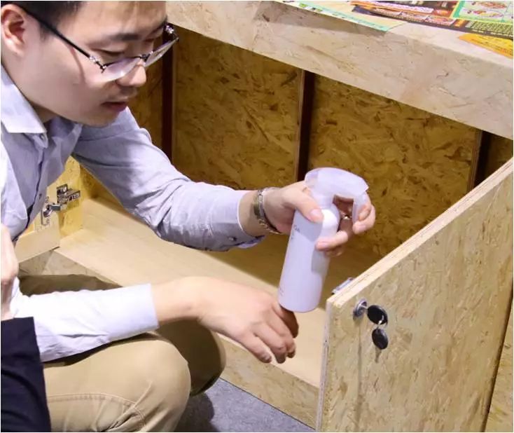 住建局張工在詳細了解了產(chǎn)品的反應(yīng)原理后,親手對展柜進行了處理,1小時后,柜體內(nèi)部甲醛數(shù)據(jù)從處理前的0.23 mg/m3下降到了0.12 mg/m3。中建鋼構(gòu)彭工提出了很多室內(nèi)空氣凈化的專業(yè)問題,對產(chǎn)品的理念和效果贊不絕口;中邦集團楊總只對柜子內(nèi)部的兩扇門進行了處理,柜子內(nèi)部的甲醛數(shù)據(jù)就從之前的0.28 mg/m3降到了0.14 mg/m3。