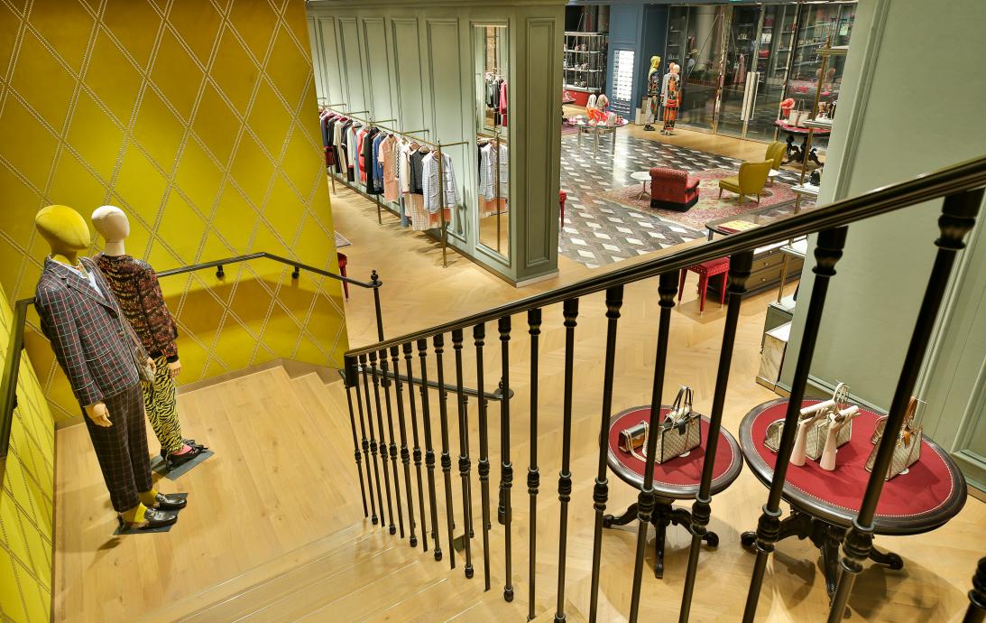 沿著復(fù)古深色木質(zhì)樓梯走到二樓,由天鵝絨、鉚釘、木材和大理石等不同材質(zhì)打造而成,處處散發(fā)低調(diào)而含蓄的氣息,為店鋪空間營造出別具一格的戲劇感。店鋪設(shè)計將傳統(tǒng)與現(xiàn)代、工業(yè)與浪漫風格相結(jié)合,與亞力山卓 ·米開理的美學(xué)視野遙相呼應(yīng),展現(xiàn)品牌優(yōu)雅的現(xiàn)代折衷主義美學(xué)。
