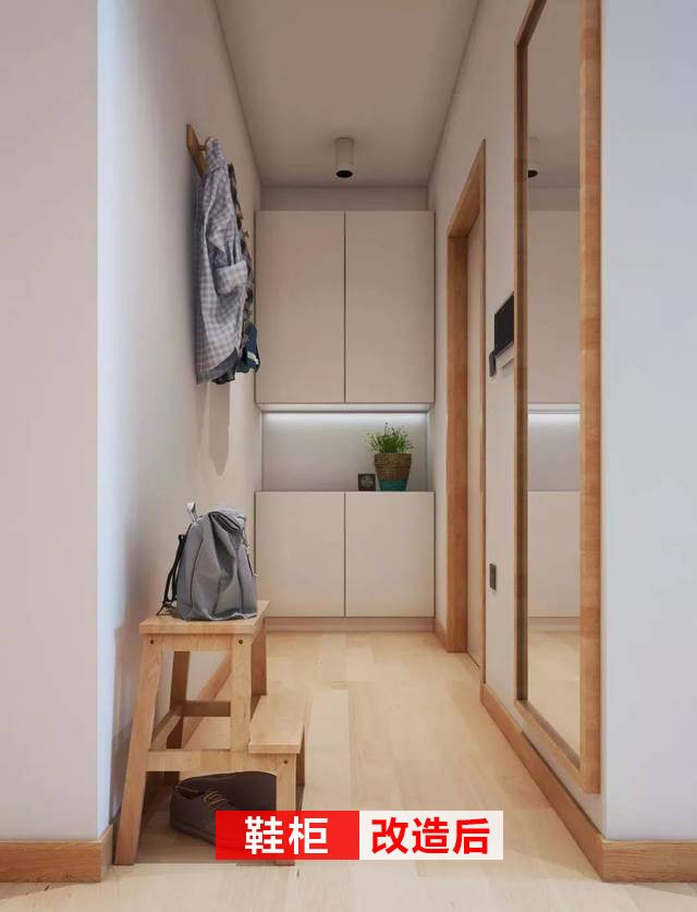 改造后的簡(jiǎn)潔清爽,和原來(lái)根本就是天差地別,干凈的白色到頂柜子,可以收納很多鞋子及其他物品,連換鞋凳和出門鏡都一一具備。