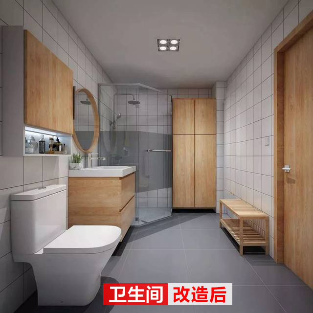 衛(wèi)生間面積還是不小的,在淋浴房旁做了一個(gè)儲(chǔ)物柜,放一些清潔物品,拖把等;馬桶上方的收納也利用起來(lái),整個(gè)衛(wèi)生間的布局趨于合理。