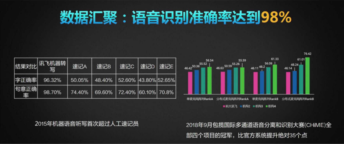 在英文語音識別、機器閱讀理解、國際識別挑戰(zhàn)賽等多個A.I.領域的國際賽事 中,科大訊飛均名列前茅, 至今已獲得12項世界第一。2018年9月,訊飛再次包攬國際多通道語音分離和識別大賽(CHiME-5)全部四個項目的冠軍,該大賽被稱為“史上最難語音識別任務”,考察的是在不同場景中自由交談的遠場語音識別效果。也再次證實了訊飛語音識別在噪音、口音和遠場識別挑戰(zhàn)下的絕對領先優(yōu)勢。與此同時,訊飛轉寫引擎于2005年開始應用服務,期間歷經(jīng)數(shù)次迭代升級。