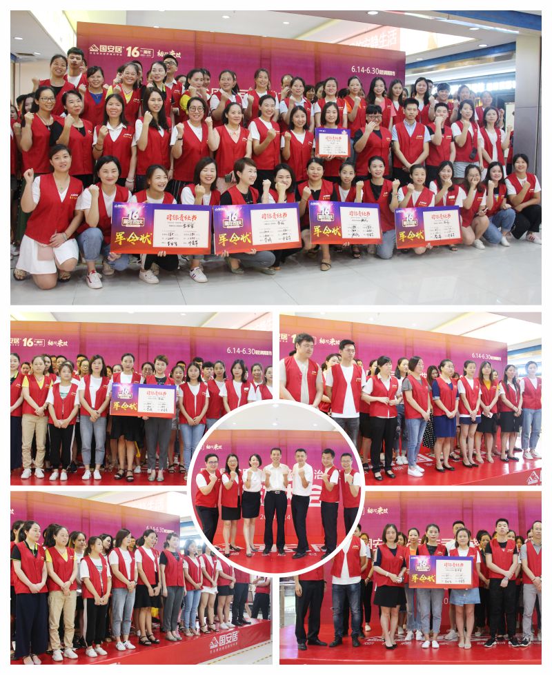 此次誓師大會(huì)作為“司慶大促”的啟動(dòng)引擎,極大地點(diǎn)燃了參與者的熱情與激情。莊嚴(yán)的誓師大會(huì)上,來(lái)自深惠各大門店的全體方陣隊(duì)員高舉隊(duì)旗,高喊口號(hào),將現(xiàn)場(chǎng)氣氛推向高潮,品牌代表們紛紛上臺(tái)發(fā)言,幾百家建材家具品牌集結(jié)成了猛虎、獵豹、雄獅、雪豹、等等團(tuán)隊(duì)方陣,登場(chǎng)亮相,高呼團(tuán)隊(duì)口號(hào),并且當(dāng)場(chǎng)簽署了司慶大惠的軍令狀,并從各商場(chǎng)總經(jīng)理的手中接過(guò)了團(tuán)隊(duì)軍旗,這將預(yù)示著“國(guó)安居16周年司慶”定將以卓越的佳績(jī),再創(chuàng)銷售的新高!