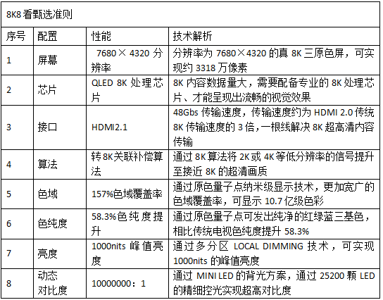 在行業(yè)趨勢(shì)及國(guó)家政策的雙重推動(dòng)下,為正確引導(dǎo)8K電視市場(chǎng)發(fā)展方向、加快發(fā)展步伐,TCL聯(lián)合國(guó)家廣播電視產(chǎn)品質(zhì)量監(jiān)督檢驗(yàn)中心經(jīng)過(guò)長(zhǎng)時(shí)間的市場(chǎng)調(diào)研及總結(jié),從行業(yè)整體的角度對(duì)8K電視進(jìn)行了初步探討,并編制出《8K8看甄選白皮書》。這份白皮書告訴我們,實(shí)現(xiàn)真正的8K震撼視覺體驗(yàn)關(guān)鍵性能/技術(shù)要求如下。