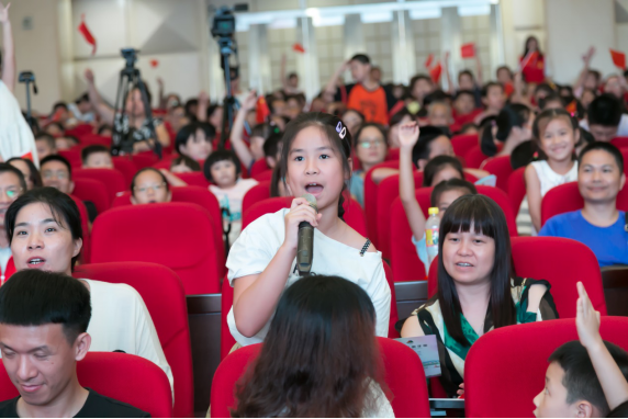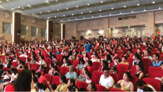 接下來,為進(jìn)一步增強(qiáng)青少年兒童的愛國意識(shí),主辦方將戲劇教育與愛國教育有機(jī)融合,于文明知識(shí)問答后,邀請近千名觀眾一起舞動(dòng)小紅旗,齊聲唱響《我和我的祖國》,點(diǎn)燃了在場每一位觀眾的愛國熱情,觀眾們跟隨著旋律,共同歌唱祖國,深情祝福祖國明天更加輝煌。