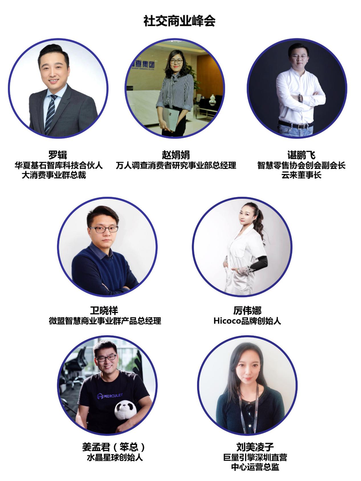 10月30日14:00—17:00(宴會廳Ⅲ)舉行社交電商峰會,華夏基石智庫科技合伙人、大消費(fèi)事業(yè)群總裁羅 輯主持峰會。萬人調(diào)查消費(fèi)者研究事業(yè)部總經(jīng)理趙娟娟演講主題《2019年深圳市消費(fèi)者線上線下渠道消費(fèi)洞察》,智慧零售協(xié)會創(chuàng)會副會長、特聘專家;云來董事長諶鵬飛演講主題《私域流量社交商業(yè)模式解碼》,微盟智慧商業(yè)事業(yè)群產(chǎn)品總經(jīng)理衛(wèi)曉祥演講主題《企業(yè)布局社交電商的四種模式》,Hicoco品牌創(chuàng)始人厲偉娜演講主題《說說美業(yè)那些事》,水晶星球創(chuàng)始人姜孟君演講主題《社群時代的影響力和業(yè)績增長》,巨量引擎深圳直營中心運(yùn)營總監(jiān)劉美凌子演講主題《D造營銷新零售助力品牌升級布局》