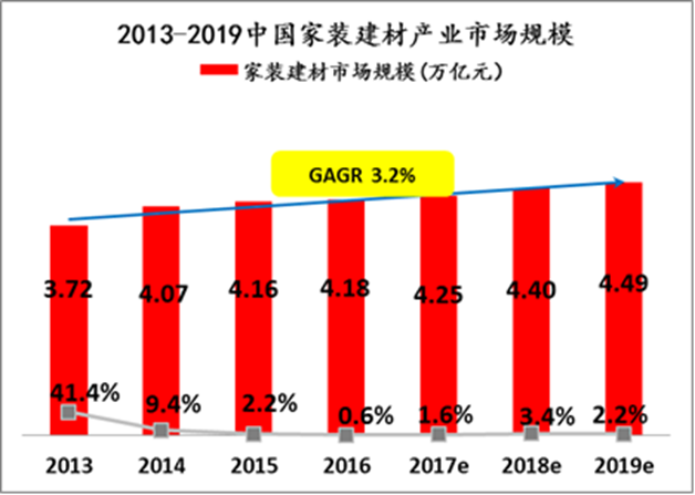 億歐智庫(kù)數(shù)據(jù)顯示,目前家裝市場(chǎng)復(fù)合年增長(zhǎng)率維持在3.2%,2019年家裝市場(chǎng)銷售規(guī)模接近4.5萬(wàn)億,但家裝建材互聯(lián)網(wǎng)滲透率小于10%,經(jīng)營(yíng)模式以傳統(tǒng)的區(qū)域性“散打”為主,無(wú)法滿足90后主體消費(fèi)者互聯(lián)網(wǎng)化、社交化、全國(guó)性購(gòu)買的需求,家裝行業(yè)大整合的呼聲越來(lái)越高。